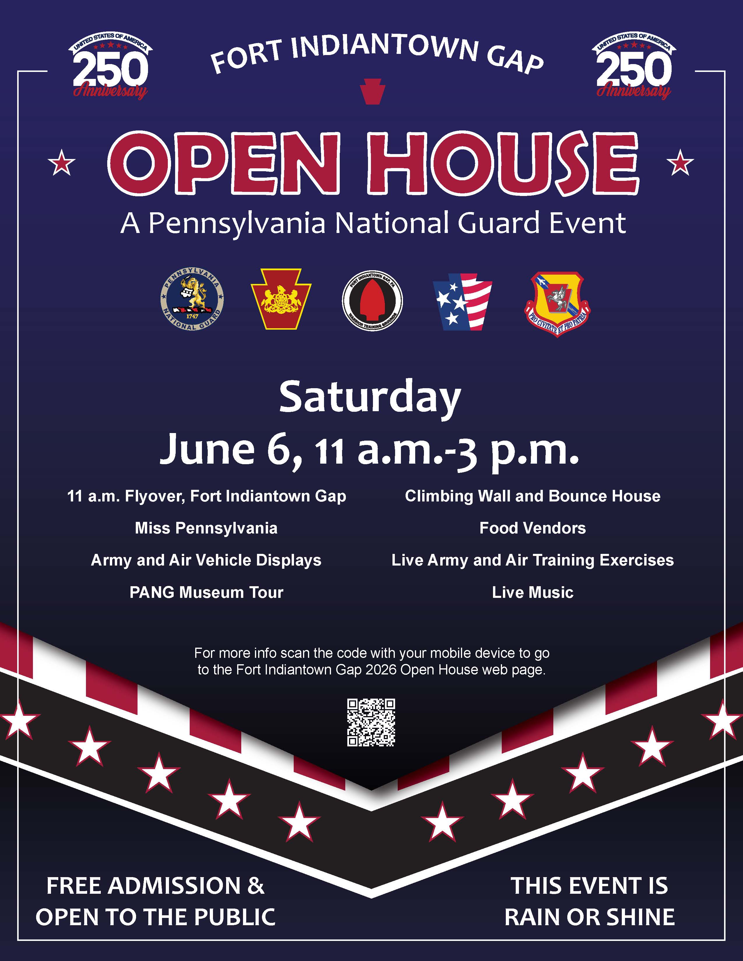 Fort Indiantown Gap will host an open house from 11 a.m. to 3 p.m. on Saturday, June 6, 2026. The event will be held along Clement Avenue, at the Fort Indiantown Gap Community Club and on the southern portion of Muir Army Heliport.